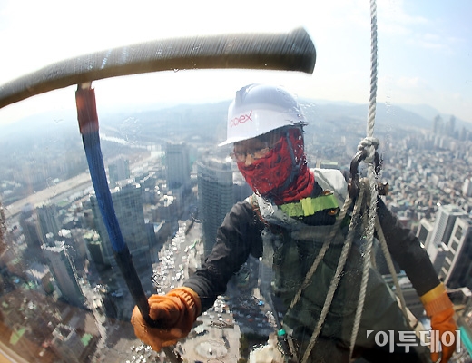 14일 오전 서울 강남구 삼성동 코엑스 54층 높이의 서울 트레이드타워에서 고층건물 외벽청소업체 직원들이 외줄에 매달려 유리창을 닦고 있다.
