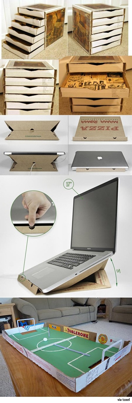간단한 물건을 수납할 수 있는 서랍장과 노트북 받침대, 미니 축구장으로 환생한 피자 박스에 네티즌들은 찬사를 보내고 있다.