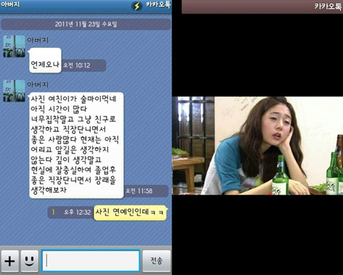 캡처에서 아버지는 “사진 네 여자친구냐. 술을 많이 먹네”라며 “넌 아직 어리니 너무 집착하지 말고 그냥 친구로 생각하며 미래를 준비하라”고 조언했다. 그러나 아들은 “사진 연예인이다”라며 재미있어 한다.
