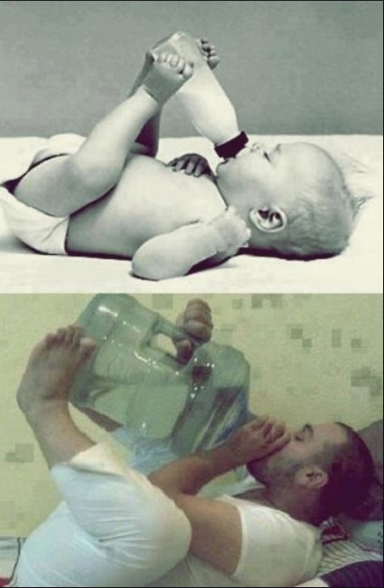 사진 속에는 아기때 발로 젖병을 물던 버릇이 성인이 돼서도 물먹을 때 생수통을 발로 받치고 먹는 남자의 모습이 담겨있다.
