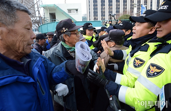 서울통일연대 회원들이 14일 오전 서울 종로구 세종로 정부서울청사 앞에서 한미연합 국사훈련 및 대북제재 중단 등을 촉구하며 농성을 벌인 가운데 보수단체인 어버이연합 회원들이 현장으로 가려 하자 경찰이 이를 저지하고 있다. 노진환 기자 myfixer@