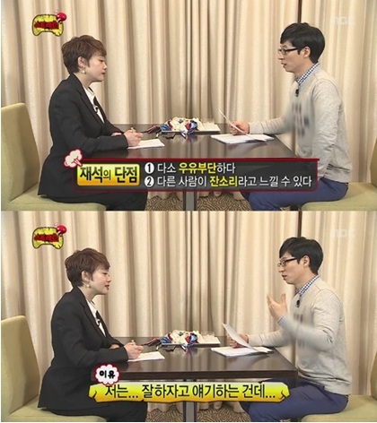 유재석은 자신의 장점으로 '열심히 한다', '잘 웃는다'를 꼽았고, 단점으로는 다소 우유부단한 성격과 잔소리를 지적했다. 유재석은 "내가 하는 말을 다른 사람들이 잔소리로 느끼는 것도 단점인 것 같다"며 "나는 잘 하자고 얘기하는 것인데 잔소리로 느끼는 멤버들도 있다"고 설명했다.