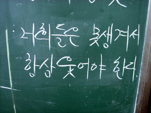 사진 속에는 선생님이 칠판에 쓴 글이 나와있다. 선생님은 칠판에 '너희들은 못생겨서 항상 웃어야 한다'는 위트있는 글을 남겼다.