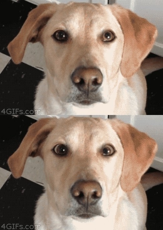 공개된 영상은 영리한 모습의 골든리트리버그 개의 얼굴을 클로즈업한 것으로 갑자기 눈이 가운데로 몰려 마치 사팔뜨기를 연상케 한다.