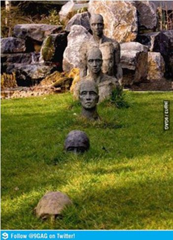 사진 속에는 잔디밭에 있는 남성의 조각상이 점점 땅 속으로 들어가고 있다.