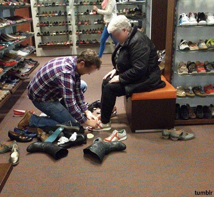 해당 사진 속에는 한 신발 가게 아르바이트생이 열심히 손님에게 신발을 신겨 주고 있는 모습이 공개됐다. 특히 한 백발의 손님이 자신이 원하는 신발을 찾기 어려운지 이것저것 닥치는 대로 신발을 꺼내놓고 신었다 벗었다를 반복한 것을 알 수 있다.