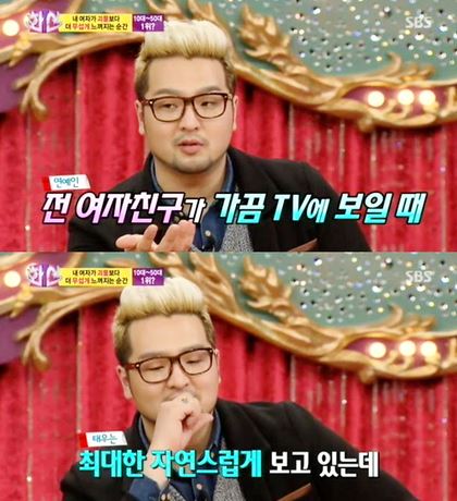 김태우는 "결혼 전 연예인과 사귄 적이 있다. 그래서 전 여자친구가 가끔 TV에서 보일 때가 있는데 불편한 마음에 그래도 최대한 자연스럽게 보면서 채널을 돌리려고 하는 경우가 있었다" 고 말했다.