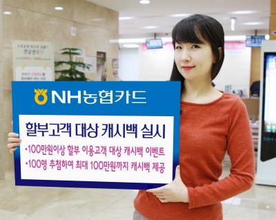 이번 행사기간 중 NH농협카드(채움, 비씨)로 100만원 이상을 할부 이용한 고객이면 누구나 응모할 수 있다. 이중 100명을 추첨해 최대 100만원까지 캐시백으로 제공한다.
