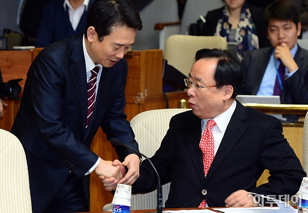 남경필 새누리당 의원과 이주영 의원이 20일 오전 국회에서 열린 최고중진연석회의에 참석하며 인사를 나누고 있다. 노진환 기자 myfixer@