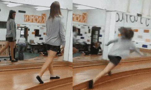 동영상에는 한 여성이 거울을 바라보며 워킹 연습을 하는 모습이 담겨있다. 이 여성은 몇 걸음을 걷다 계단을 잘못 밟아 앞으로 넘어지고 만다.