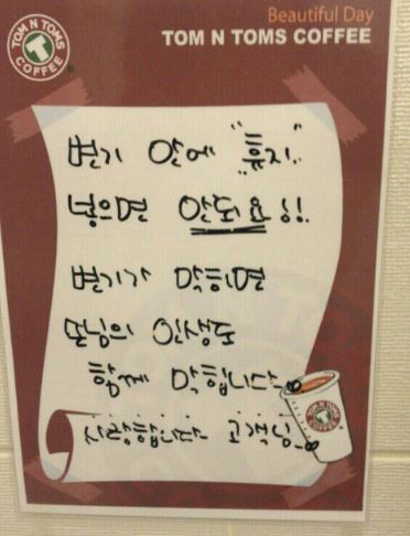 사진 속 커피숍 직원의 메모에는 “변기가 막히면 손님의 인생도 함께 막힙니다”라는 글이 적혀 있다.