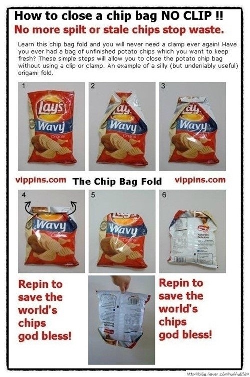 이에 따르면 과자봉지의 양쪽 끝을 비스듬히 접은 뒤 위에서부터 다시 두 번 접어준 후 접은 부분을 뒤집어 단단하게 고정시켜주면 된다. 이렇게 접으면 과자봉지가 완벽하게 밀봉돼 먹다 남은 과자를 눅눅해지지 않도록 보관할 수 있다.