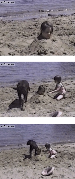 남자아이는 얼굴을 제외한 몸이 모래에 파묻혀 있고, 옆에서 여자아이가 모래를 정돈하고 있다.