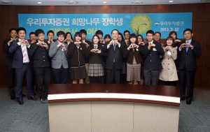 우리투자증권은 지난 2005년부터 사회공헌활동의 일환으로 매년 전국 우수 고등학생을 해발, 미래의 꿈나무들이 학업에 정진할 수 있도록 장학금을 수여하고 있다. 희망나무 장학금’은 단순한 학비 지원에 그치는 것이 아니라, 해당 장학생과 인근지역 우리투자증권 지점이 자매결연을 맺고 지속적인 유대관계를 형성하고 있다. 1:1 멘토링 프로그램 등을 통해 청소년들이 미래의 인재로 성장해 나갈 수 있도록 통합적인 지원을 하고 있는 것이다.