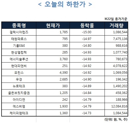 22일 코스피시장에서 2개 종목, 코스닥 시장에서 11개 종목 등 총 13개 종목이 하한가를 기록했다.
