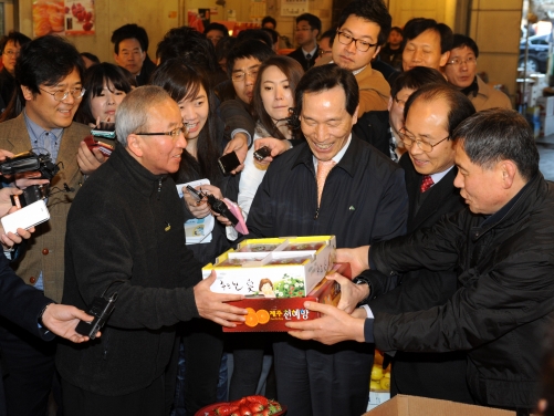 현오석 부총리 겸 기획재정부장관이 23일 취임 첫 현장방문으로 서울 가락동 농수산물도매시장을 방문해 상인과 이야기를 나누며 딸기 1만7000원어치를 구입하고 있다.