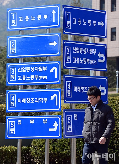 지난 22일 정부조직법 개편안이 국회 본회의를 통과함에 따라 정부부처의 윤곽이 정해지고 있다. 25일 오후 정부과천청사에 새로운 정부부처 안내판이 설치돼 있다. 노진환 기자 myfixer@