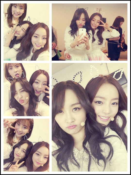 사진 속엔 니콜, 구하라, 강지영이 함께 대기실에서 포즈를 잡고 있는 모습이 담겨 있다. 특히 귀여운 고양이 귀 머리띠를 착용해 눈길을 끌었다.