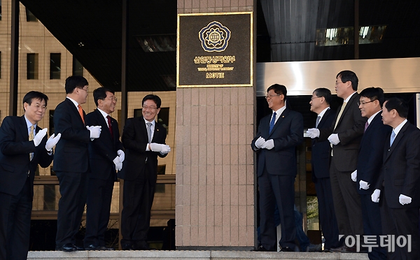 윤상직 산업통상자원부 장관(왼쪽 네 번째)과 김재홍 1차관(왼쪽 다섯 번째) 등이 25일 오후 정부과천청사에서 진행된 산업통상자원부 현판식에 참석해 현판을 제막하고 있다. 노진환 기자 myfixer@
