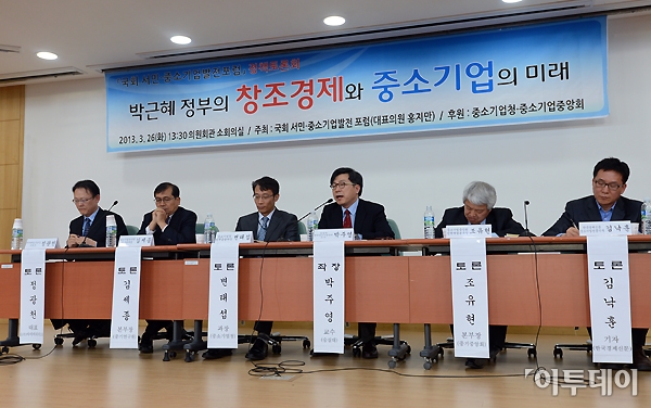 국회 서민·중소기업발전포럼 정책토론회가 26일 오후 국회 의원회관 소회의실에서 ‘박근혜 정부의 창조경제와 중소기업의 미래’를 주제로 개최됐다. 박주영 중소기업학회 사무국장(왼쪽 네 번째)이 주제발표를 하고 있다. 노진환 기자 myfixer@