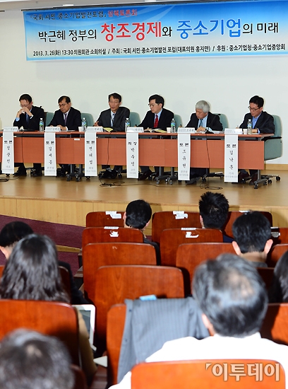 국회 서민·중소기업발전포럼 정책토론회가 26일 오후 국회 의원회관 소회의실에서 ‘박근혜 정부의 창조경제와 중소기업의 미래’를 주제로 개최됐다. 변태섭 중소기업청 정책총괄과장(왼쪽 세번째)이 주제발표를 하고 있다. 노진환 기자 myfixer@