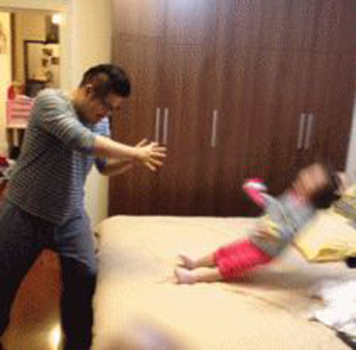 해당 영상 속 아빠와 딸은 장난을 치고 있다. 침대 위에 있는 딸에게 아빠가 장풍을 날리자 뒤로 넘어가는 모습이 무척 귀엽다.