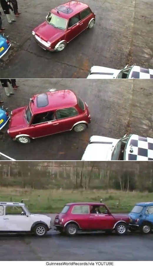 이들은 소형 승용차를 몰고 평행주차 세계 기록 도전에 나섰고 수 차례의 실패 끝에 세계기록 도전에 성공했다.