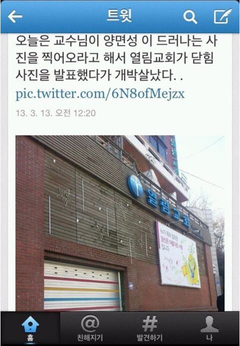 대학생으로 보이는 한 트위터리안은 최근 “오늘은 교수님이 ‘양면성이 드러나는 사진’을 찍어오라고 해서 ‘열림교회가 닫힘’ 사진을 발표했다가 개박살났다”는 글과 함께 사진 한 장을 올렸다.