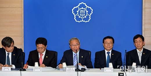 현오석 경제 부총리 겸 기획재정부 장관(가운데)과 경제 관련 부처 장관들이 28일 오후 서울 세종로 정부서울청사에서 박근혜 정부의 '2013년 경제정책방향‘에 대해 합동 브리핑'을 하고 있다. 방인권 기자 bink7119@