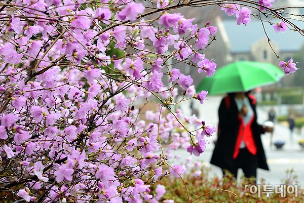 봄비가 촉촉하게 대지를 적시고 있는 2일 오전 서울 서대문구 이화여대에서 한 학생이 우산을 쓰고 교정을 지나고 있다. 노진환 기자 myfixer@