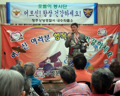 한 요양원의 노인들을 대상으로 품바 공연에 나선 윤 경사는 우스꽝스러운 거지 복장을 하고 마이크를 잡았다.