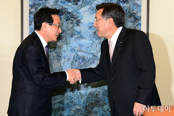 김기문 중소기업중앙회장(오른쪽)과 최수현 금융감독원장이 8일 오후 여의도 중소기업중앙회에서 만나 악수를 하고 있다. 이 자리에서 김기문 원장과 최수현 원장은 금융권의 불공정한 거래행위와 불합리한 제도 등에 대해 논의할 예정이다. 노진환 기자 myfixer@
