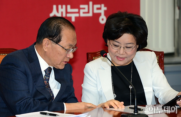황우여 새누리당 대표와 이혜훈 최고위원이 8일 국회 대표최고위원실에서 열린 최고위원회의에 참석해 이야기를 나누고 있다. 노진환 기자 myfixer@