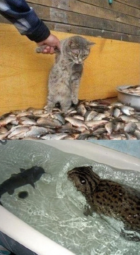 두 번째 사진에는 메기로 보이는 물고기와 함께 욕조에 있는 고양이의 모습이 담겨 있다. 이 또한 고양이에게는 참을성이 요구되는 상황으로 웃음을 유발한다.