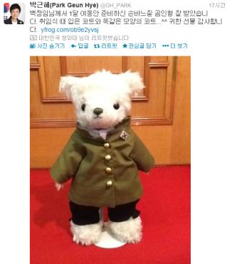 박 대통령은 이 트위터 메시지에 흰색 곰인형 사진도 함께 첨부했다. 사진 속 곰인형은 지난 2월 국회에서 열린 18대 대통령 취임식 때 박 대통령이 입었던 코트와 비슷한 카키색 롱 코트를 입고 있고 있다. 곰인형의 왼쪽 가슴에는 태극기 모양의 배지도 달려 있다.