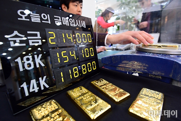 박근혜 정부의 지하경제 양성화 조치와 대북 리스크 상승으로 인해 국제시장에서 금값이 하락함에도 불구하고 국내에서 골드바를 찾는 수요는 늘고 있다. 또한 장기적인 부동산 침체와 낮은 예금이자도 금을 찾는 이유이기도 하다. 사진은 10일 오후 서울 종로구 묘동의 한국금거래소의 모습. 노진환 기자 myfixer@