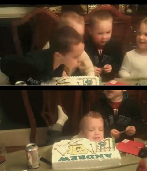 앤드류는 촛불을 끄기 위해 케이크 앞으로 다가갔다. 순간 옆에 있던 아이가 대신 촛불을 껐고, 앤드류는 이에 놀라 케이크에 얼굴을 묻고야 만다.