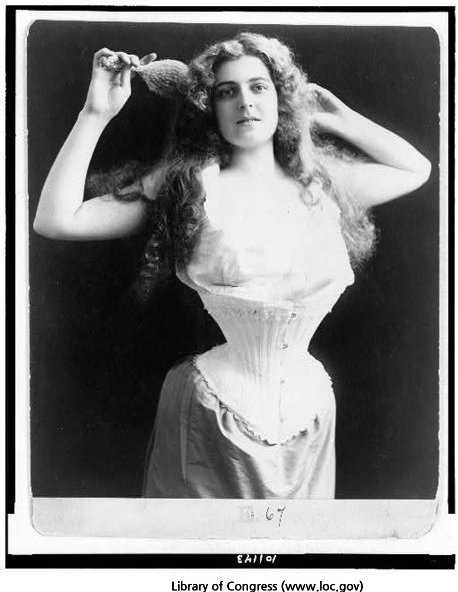 사진 속 여성은 코르셋으로 강하게 압박한 결과 모래시계 체형, 즉 영어식 표현으로 '말벌 허리' 체형을 뽐내고 있다.