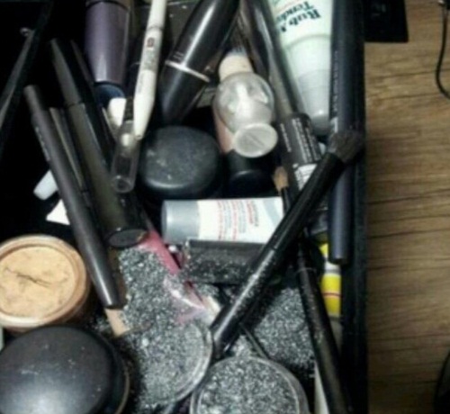 문제는 마스카라, 섀도우, 라이너 등 여성 화장품 사이로 병에 담긴 '피그먼트'가 쏟아진 것.