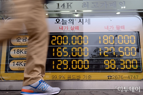 국제 금값이 폭락했다. 15일 뉴욕상품거래소에 따르면 금 선물 가격은 이틀 동안 200달러 이상 떨어져 33년 만에 최대 낙폭을 기록했다. 16일 오후 서울 영등포구 한국금거래소에 금 판매가격과 매입가격이 나타나 있다. 노진환 기자 myfixer@