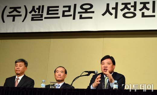 서정진 ㈜셀트리온 회장(오른쪽)이 16일 오전 서울 영등포구 여의도 63시티에서 긴급 기자회견을 하고 있다. 이날 서 회장은 5월 셀트리온이 만든 항체 바이오시밀러(바이오복제약)의 유럽연합 판매 허가가 떨어지면 자신이 보유한 셀트리온 주식 및 계열사 주식을 다국적 제약사에 매각할 것이라고 밝혔다. 방인권 기자 bink7119@