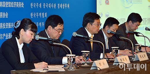 제 9회 중국-동북아박람회 서울설명회가 17일 오전 서울 중구 소공동 롯데호텔에서 열렸다. 이날 행사에 참석한 추장정 중국대사관 경제참사처 공사(가운데)가 박람회에 대해 국내외 취재진에게 설명을 하고 있다. 방인권 기자 bink7119@