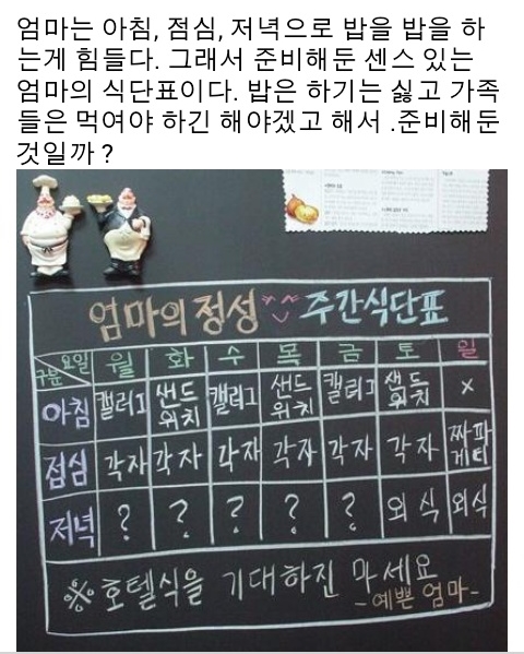 해당 게시물을 본 네티즌들은 "센스 있는 엄마의 식단표만 보면 엄마의 일거리가 거의 없는 셈" "해도 너무한다"등의 반응을 보였다.