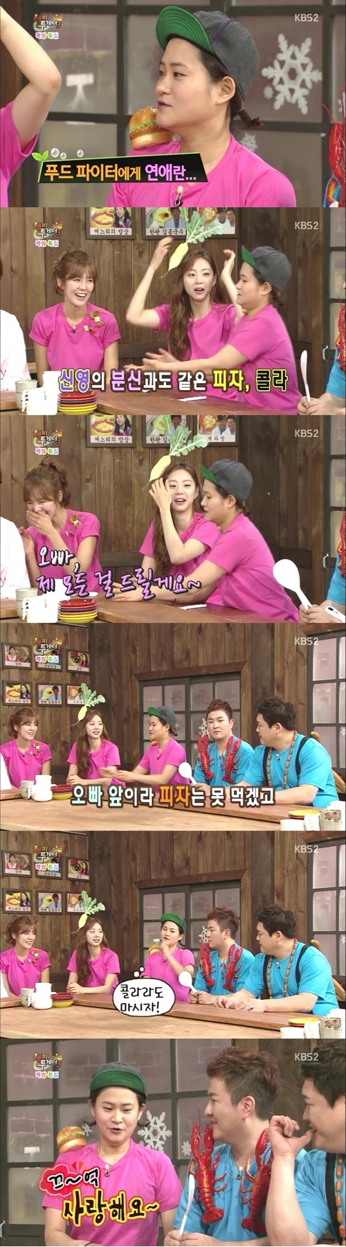25일 방송된 KBS 2TV ‘해피 투게더3’에 출연한 김신영은 "대학시절 선배들이 좋아하는 선배와 연결시켜준다고 부추겨 핫도그 많이 먹기 대회에서 1등을 한 적이 있다"며 말문을 열었다.
