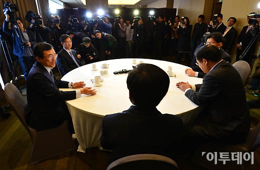 경제5단체 부회장들이 26일 서울 중구 플라자호텔에서 경제현안 관련 긴급회동을 갖고 있다. 왼쪽부터 김무한 한국무역협회 전무, 송재희 중소기업중앙회 부회장, 김영배 한국경영자총협회 부회장, 이동근 대한상공회의소 부회장, 이승철 전국경제인연합회 부회장. 양지웅 기자 yangdoo@
