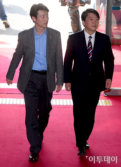 4·24 재보궐 선거 서울 노원병에 당선된 안철수 무소속 의원이 26일 오전 송호창 의원과 함께 국회 본청으로 들어서고 있다. 노진환 기자 myfixer@