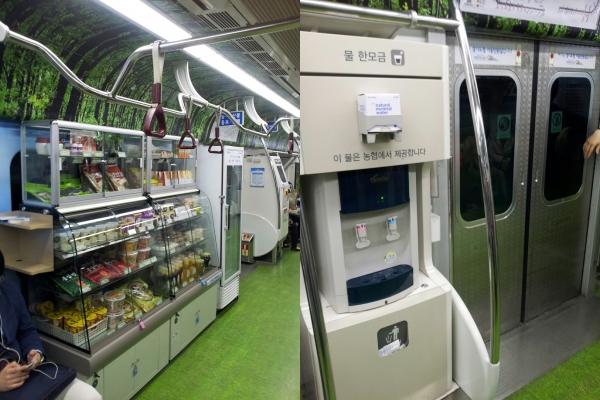 글쓴이는 "방금 병정행 지하철. 처음 봤어요!"라며 사진 두 장을 공개했다. 사진에는 지하철 안에 정수기는 물론 각종 음료수를 파는 자판기까지 갖춰져 있다.