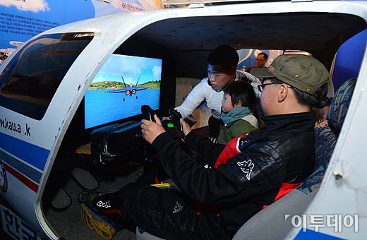 ‘2013경기안산항공전’이 1일 오전 경기 안산시 상록구 경기테크노파크 앞에서 열렸다. 근로자의 날을 맞아 나들이 나온 어린이들이 모의비행 체험을 하고 있다.