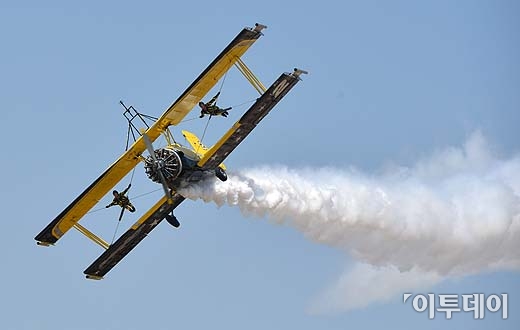 ‘2013경기안산항공전’이 1일 오전 경기 안산시 상록구 경기테크노파크 앞에서 열렸다. 행사에 참가한 스칸디나비안 에어서커스팀이 관람객들에게 멋진 곡예를 선보이고 있다.