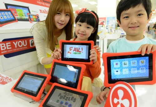 어린이 모델들이 1일 오전 서울 이마트 청계천점에서 교육용 태블릿 PC '나비(nabi)'를 들고 포즈를 취하고 있다. 미국 푸후가 개발한 나비는 키즈용 태블릿PC로 기존 아동용 태블릿과는 달리 학습을 중심으로 출시됐다.